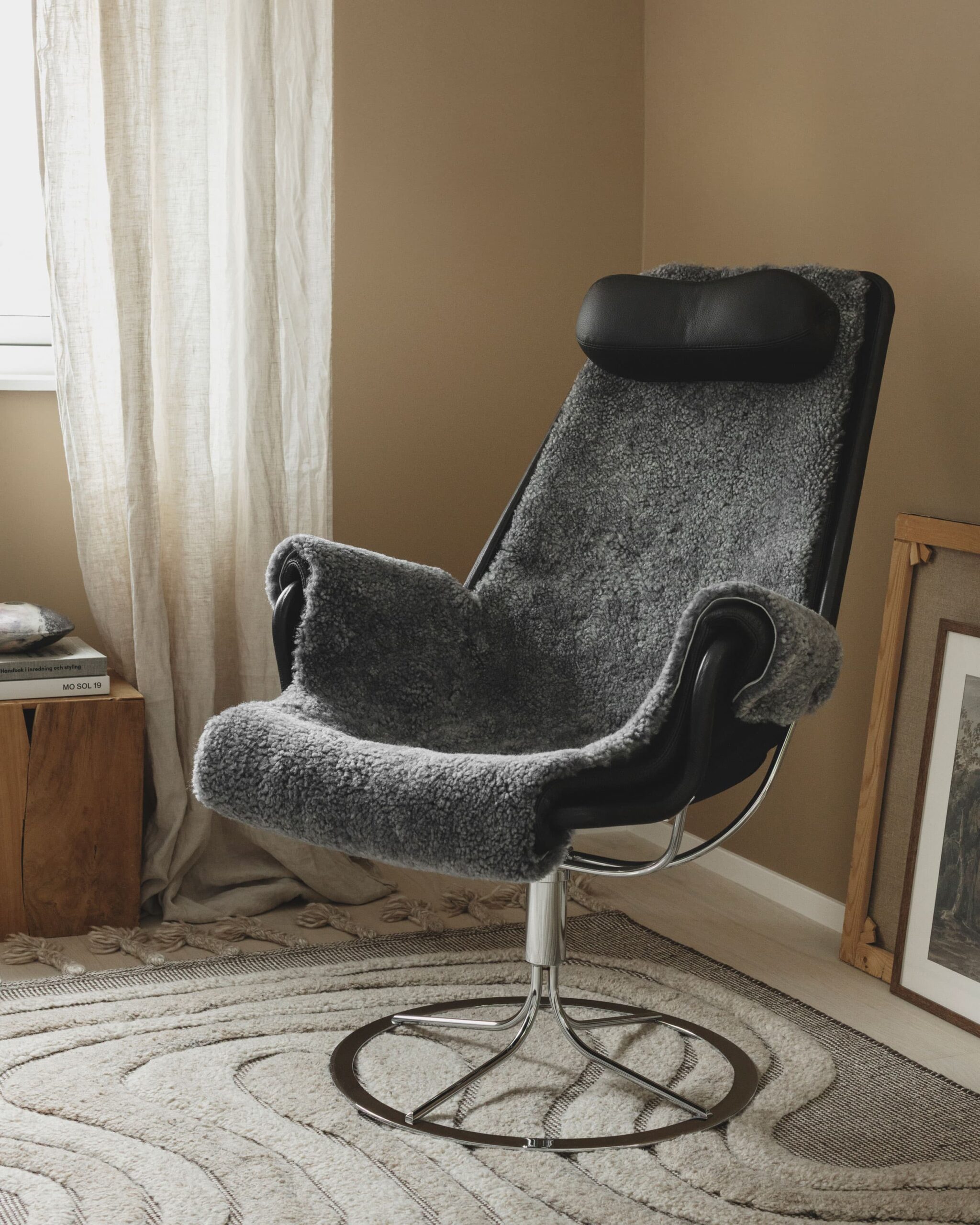 Chair cover in curly sheepskin that gives your furniture a natural and soft appearance. Fits the Jetson chair and is installed in the existing grommet holes of the chair. Size 35-52×115 cm.