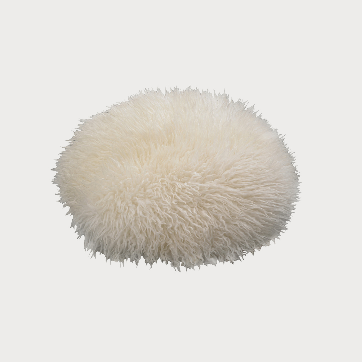 Round decorative cushion in long-wooled lambskin from New Zealand. Size Ø40cm. With its round shape it fits perfectly in a sofa, armchair, or bed. Back side in polyester fabric matching the colour of the sheepskin. Equipped with a hidden zipper. Inner cushion included.